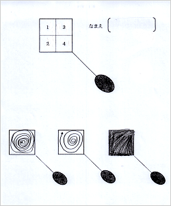 右下の楕円に手を置いた状態で子どもは指導者が指示する番号を鉛筆の先でタップします。