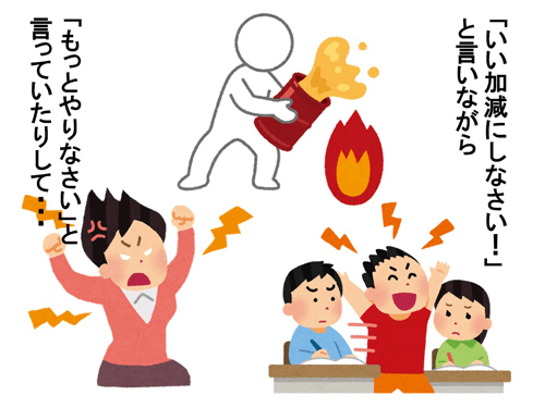 教師は、しばしば指導という名の下で不適切な行動に意味を与えてしまうことがあります。注意されることや叱られること、そして怒られること、それが注目であると学んでしまった子にとっては、それらの行為は報酬でしかありません。注意する度、叱る度、そして怒る度にご褒美をあげていることになります。「火に油を注ぐ」状態です。