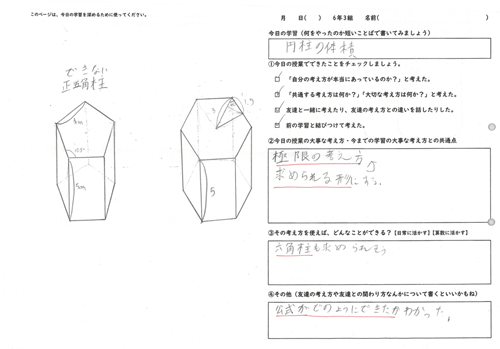この子どもは、円柱の求め方で使った考え方を使えば、正五角柱や正六角柱も求められるのではないかと考え、裏面左側の白紙スペースに問題を発展させていきました。結果的に、体積を求めることはできませんでしたが、「底面を合同な二等辺三角形に等分して、二等辺三角形の高さがわかれば求めることができる」ということには気づいていました。